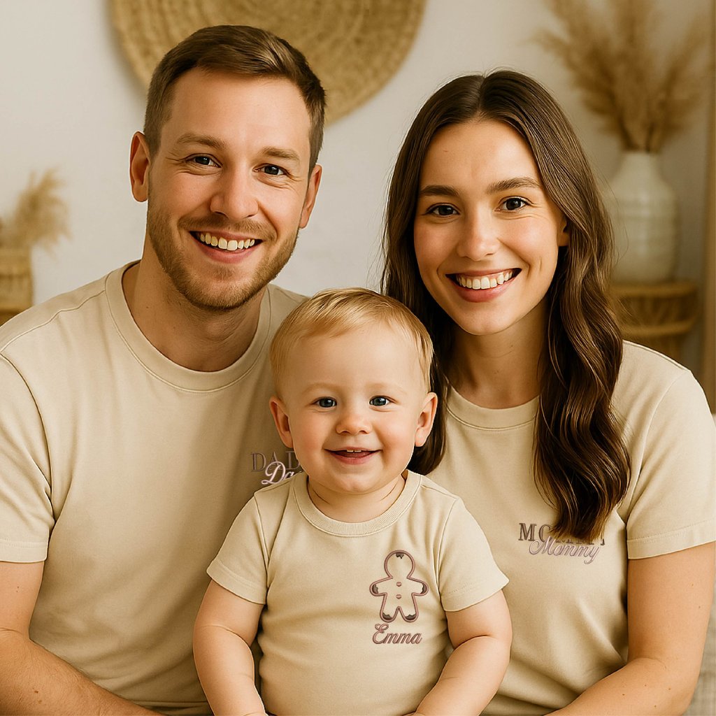 Užijte si rodinné chvíle v jedinečném stylu s našimi personalizovanými tričky. Každý člen Vaší rodiny si zaslouží své vlastní tričko s originální výšivkou Mommy, Daddy a perníčka se jménem Vašeho dítěte, které udělá každou společnou chvíli ještě výjimečnější. Do poznámky uveďte jméno dítěte. Objednejte si rodinná trička ještě dnes a vytvořte tak dokonalý outfit pro celou rodinu.