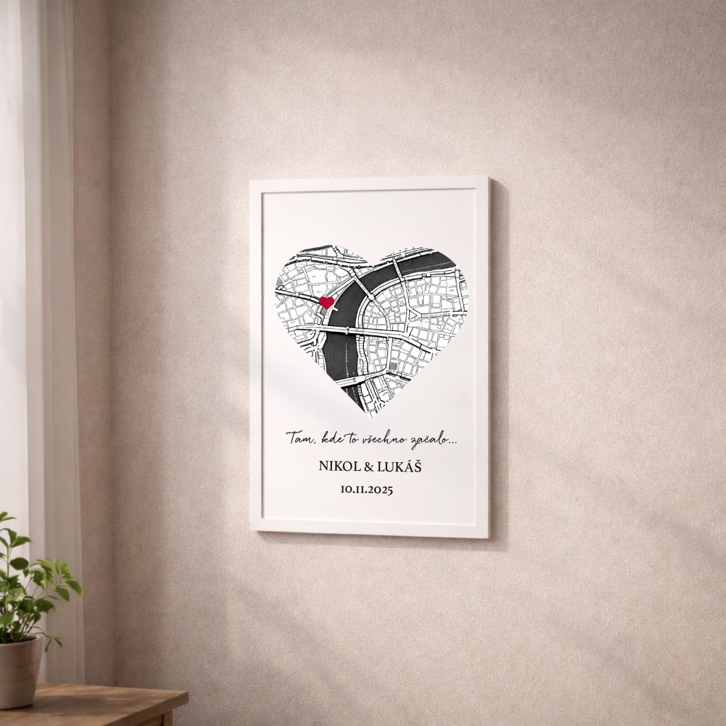 Plakát "TAM KDE VŠECHNO ZAČALO" zachycuje přesně ten bod na mapě, kde se začal psát váš společný příběh. Plakát si u nás můžete zarámovat do černého, nebo bílého rámu, který krásně ladí k designu plakátu.