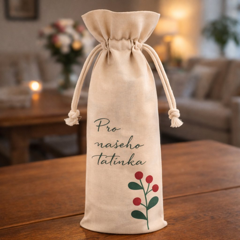Hledáte originální a osobní dárek pro tatínka? Náš pytlík na víno s potiskem PRO NAŠEHO TATÍNKA je ideálním řešením. Tento elegantní pytlík je nejen krásným suvenýrem, ale také praktickým doplňkem k vínu.