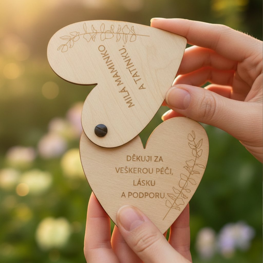 Poděkování se skládá z dvou dřevěných srdíček a knihařského šroubku, který umožní otevíráni a zavírání srdce.