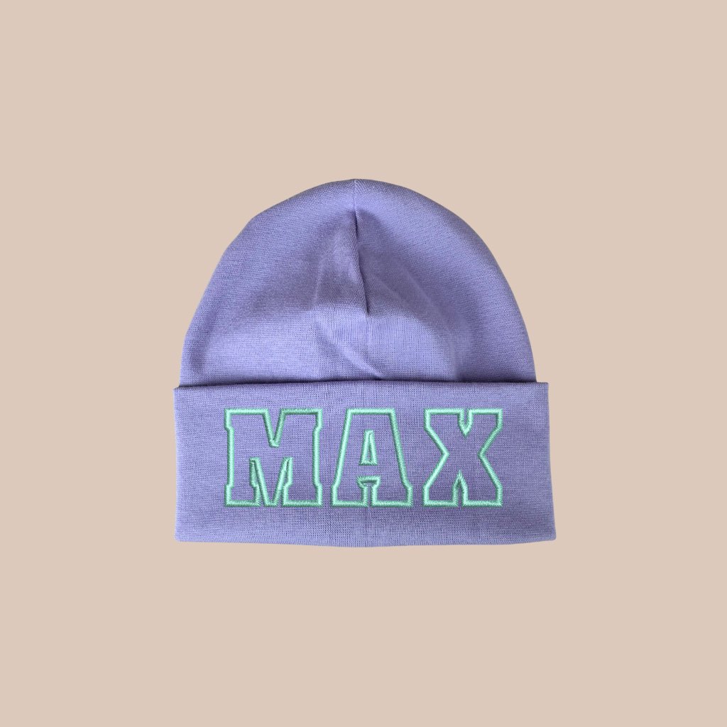 Jarní čepička s barevným vyšitím jména Vašeho dítěte. Detail čepičky, je vyšitý barevnou nití. Čepička je z hladkého úpletu, je pružná a poddajná. Krásně sedí na hlavičce.