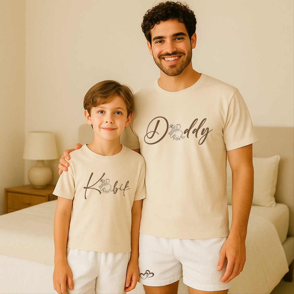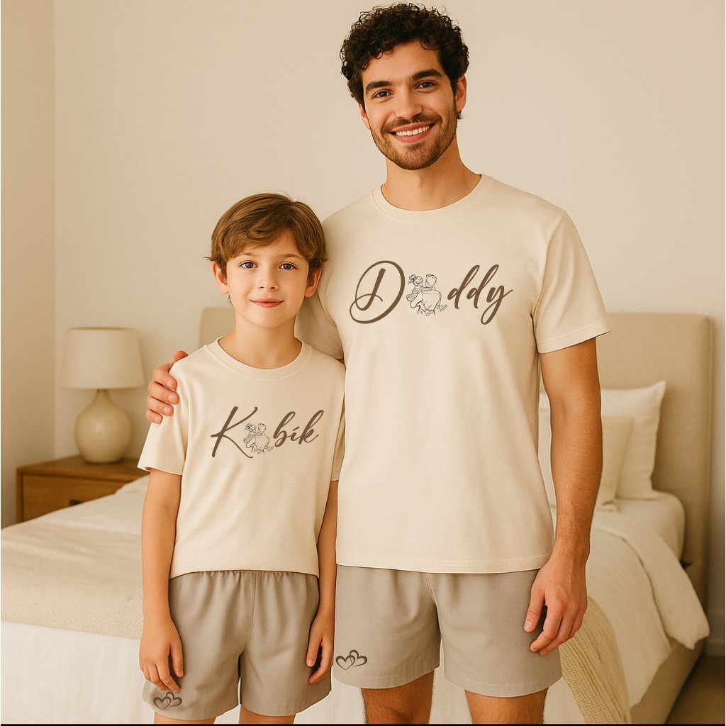 Pyžamový set s potiskem nápisu DADDY, JMÉNEM DÍTĚTE a OBRYSU FOTOGRAFIE pro muže a dítě je ideální volbou. Tento kvalitní komplet obsahuje bavlněné trenky a tričko s krátkým rukávem, zdobené motivem nápisu daddy, jménem dítěte a vlastní fotografií. Perfektní dárek ke Dni Otců, narozeninám nebo jen tak pro radost. Do poznámky napište jméno dítěte.