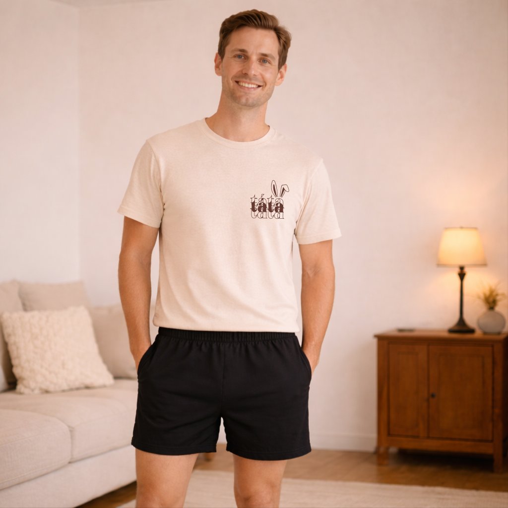 Objevte pohodlí a styl s naší pánskou soupravou pyžama, která kombinuje tričko z biobavlny s potiskem "Táta" a bavlněné trenky s veselým motivem zajíčka. Tento set je ideální pro relaxaci doma nebo lenošení v posteli. Veselý motiv zajíčka přidává hravý prvek, který jistě ocení každý muž.