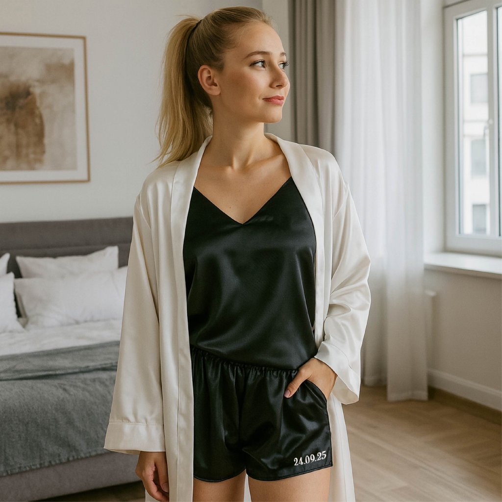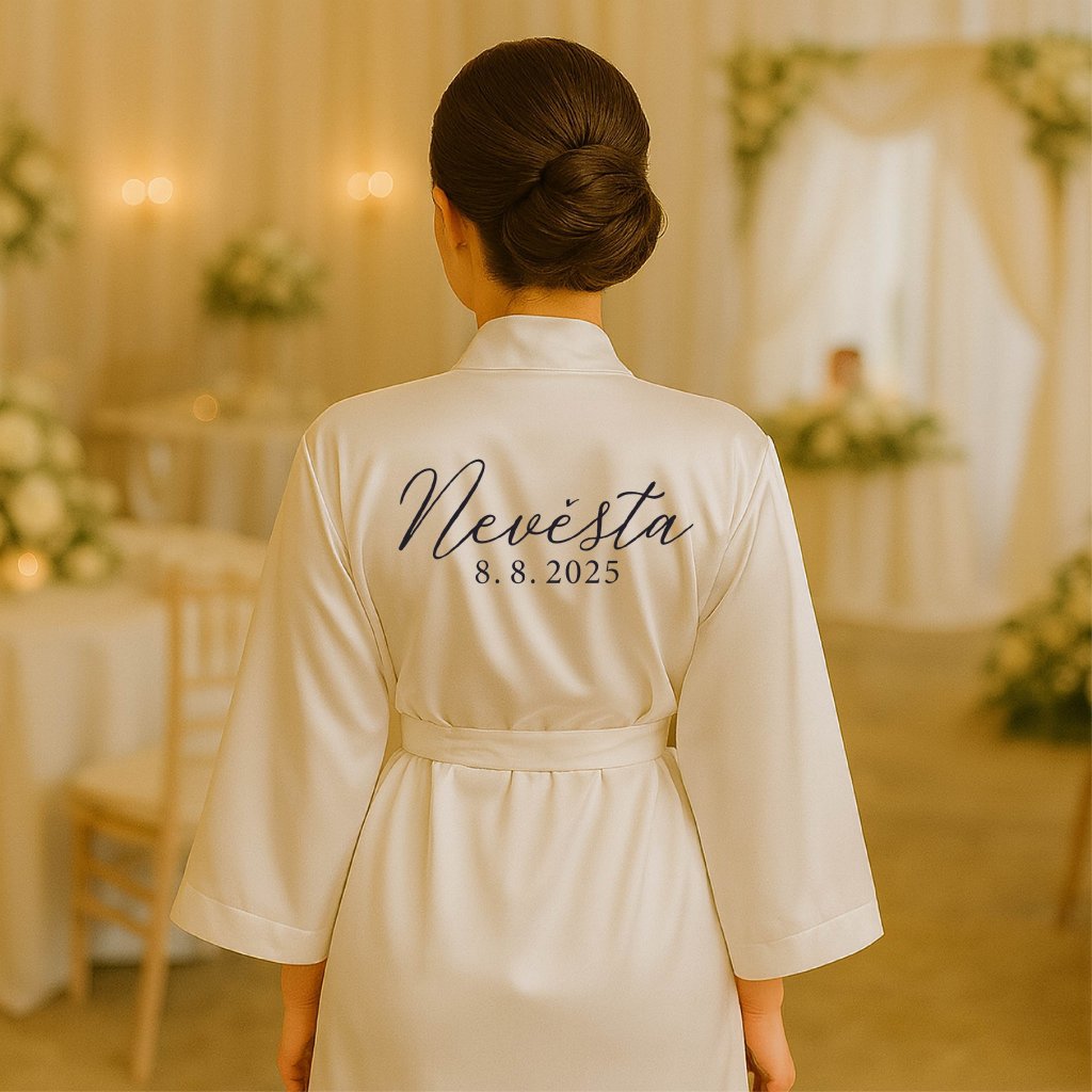 Saténový set bílého župánku a pyžámka pro nevěstu je ideálním doplňkem pro přípravy na její velký den. Tento elegantní set zahrnuje jemný saténový župan a pohodlné pyžámko, které lze personalizovat podle Vašich představ. Na župánek Vám natiskneme vlastní datum svatby a na pyžámko našijeme iniciály nebo také datum svatby. Tento saténový set nejenže přidá nádech luxusu do Vašich svatebních příprav, ale také se stane krásným doplňkem pro svatební fotografie a videa ze zákulisí. Nechte si svůj set zabalit do dřevěné krabičky s gravírováním "Nevěsta" a vlastním datem svatby, což z něj činí dokonalý dárek pro budoucí nevěstu.