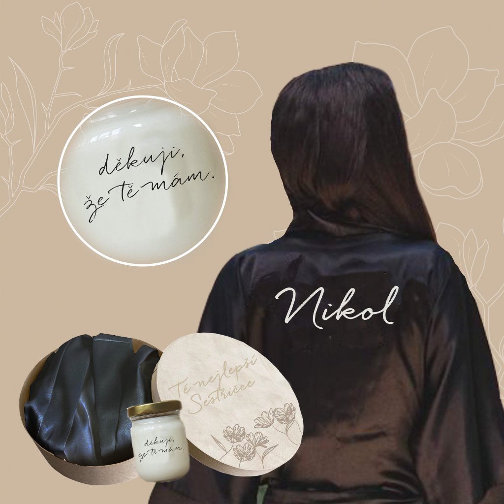 Elegantní set saténového župánku v dárkové, dřevěné krabičce se svíčkou s vůní ořechů a karamelu. Kouzelné balení, které za Vás řekne, jak moc Vám na sestřičce záleží!