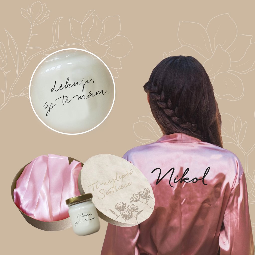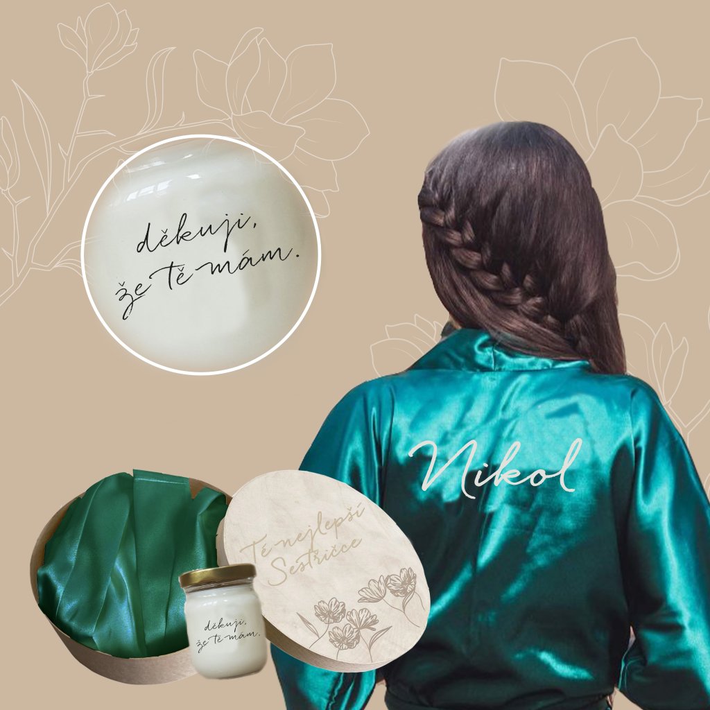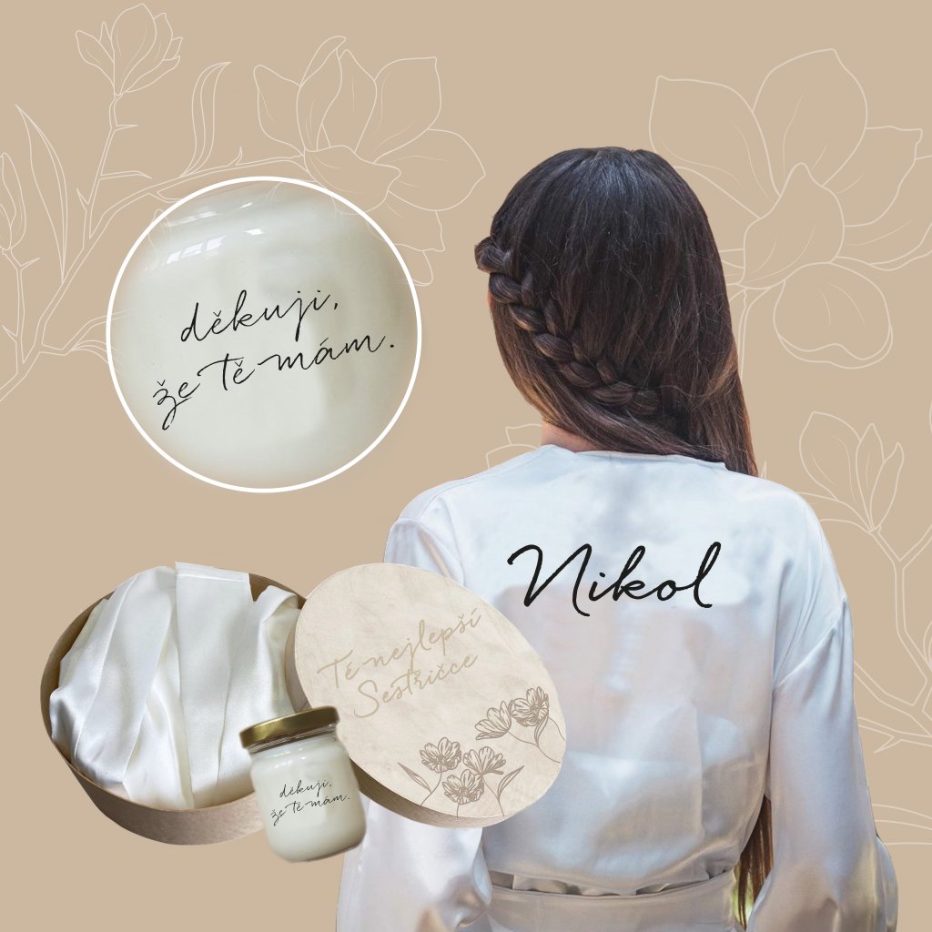 Set saténového župánku se svíčkou a dřevěnou krabičkou s věnováním sestřičce