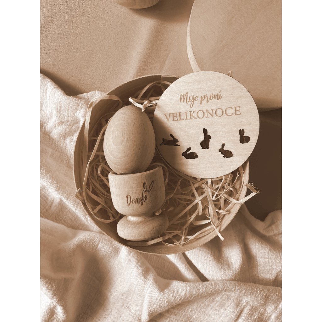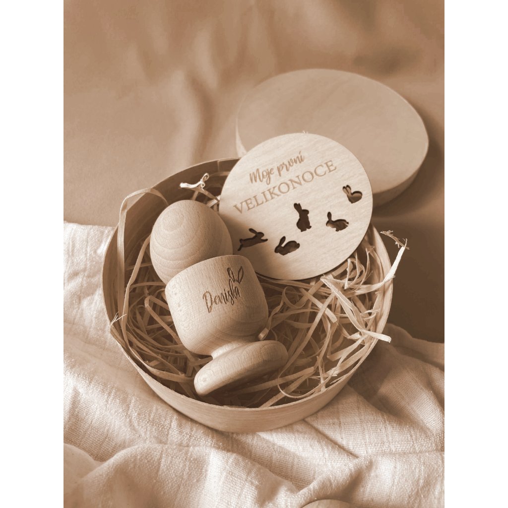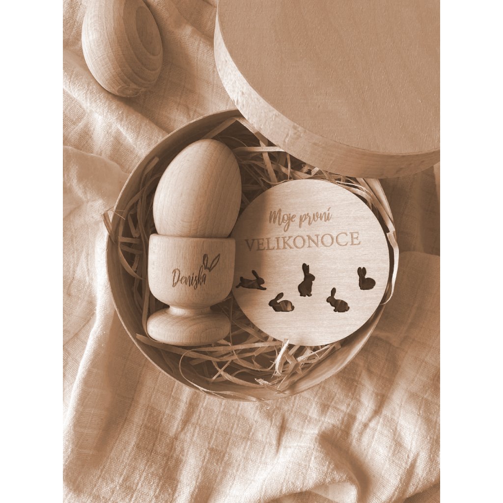 Set dřevěného kalíšku na vajíčko s gravírováním vlastního jména a milníkové kartičky v dárkové krabičce. Vajíčko si děti můžou pomalovat podle svých představ. Skvěle se tak zabaví při kreativní tvorbě a výslužka pro koledníka tak bude více osobní.