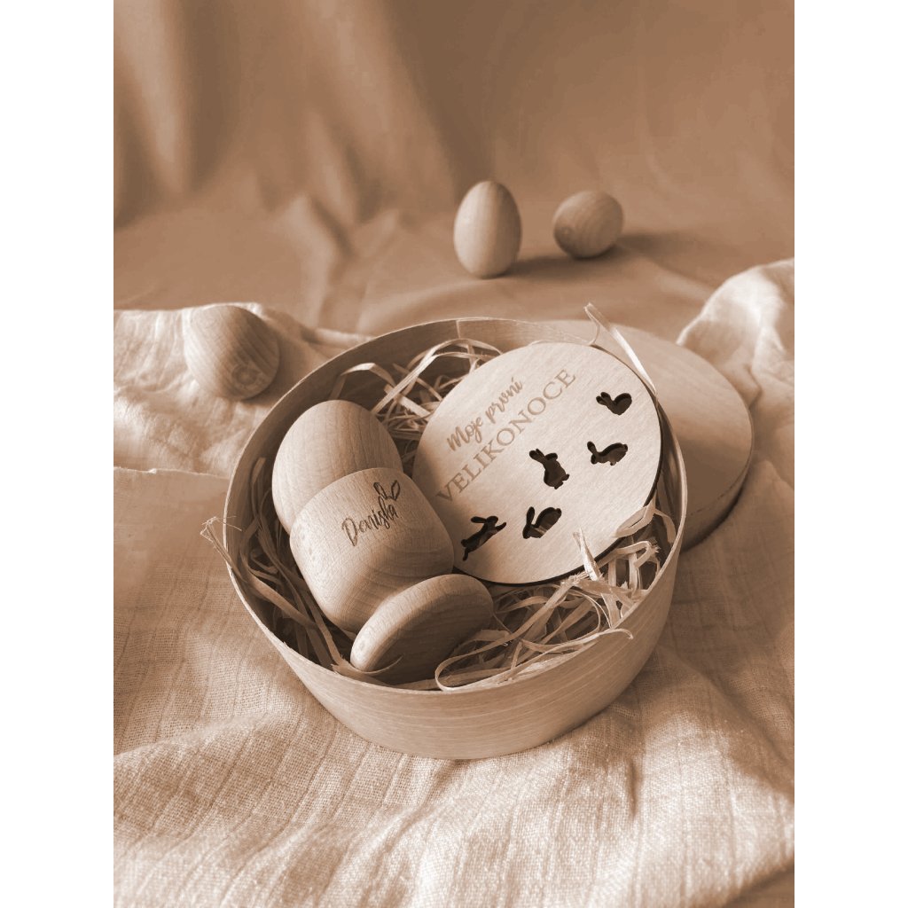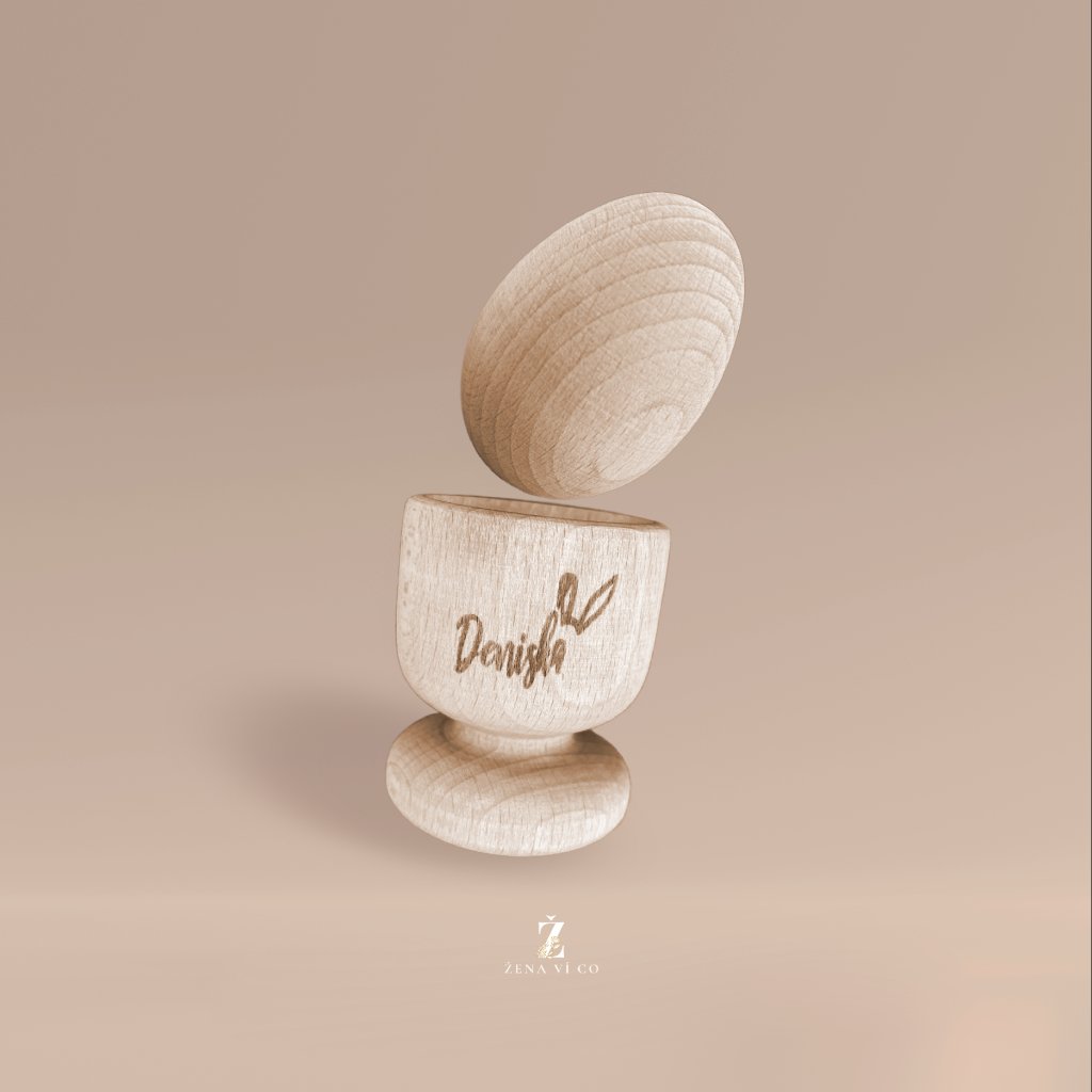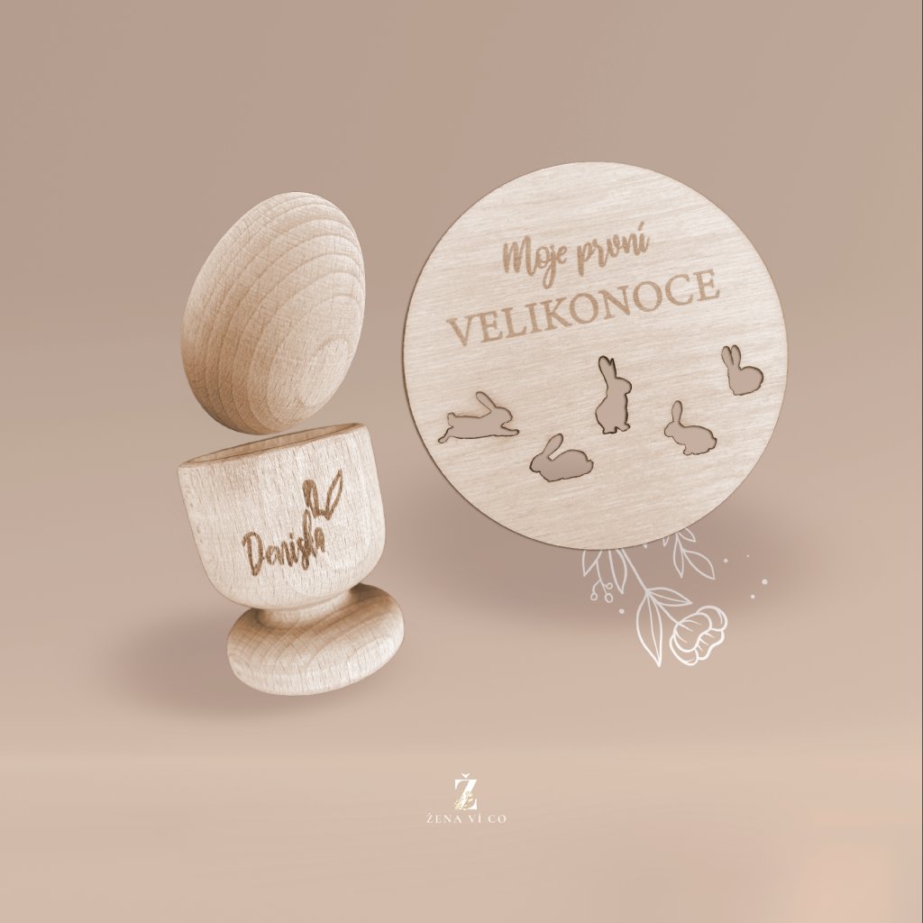 Set dřevěného kalíšku na vajíčko s gravírováním vlastního jména a milníkové kartičky v dárkové krabičce. Vajíčko si děti můžou pomalovat podle svých představ. Skvěle se tak zabaví při kreativní tvorbě a výslužka pro koledníka tak bude více osobní.