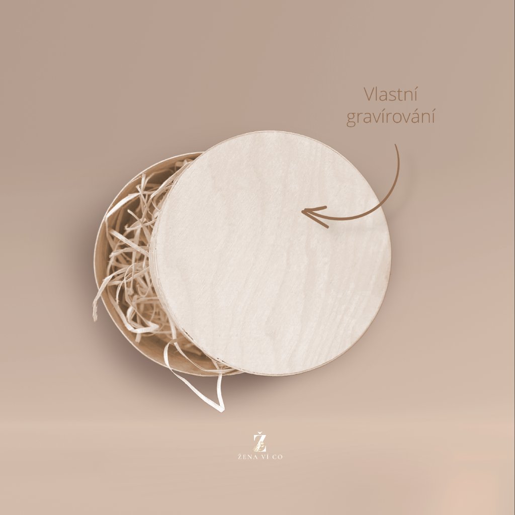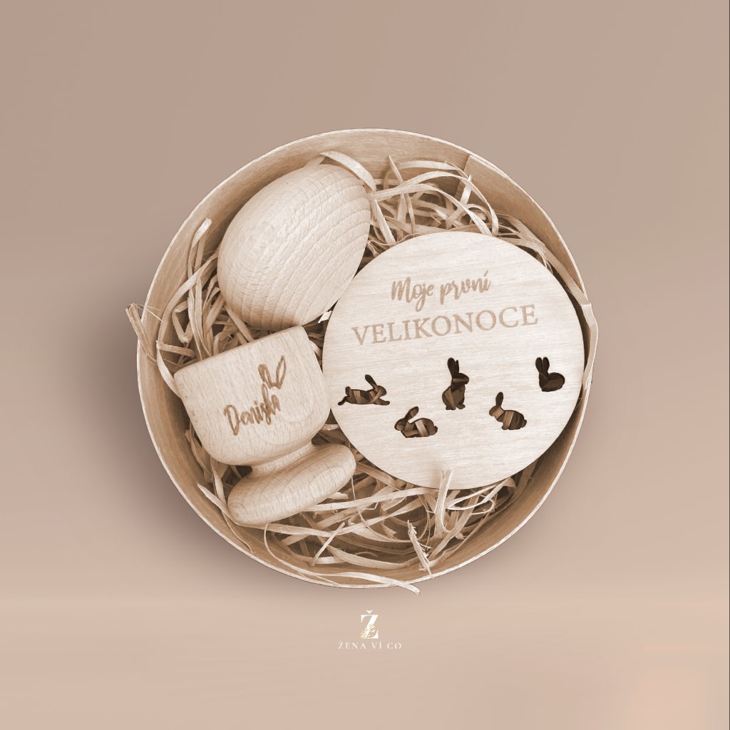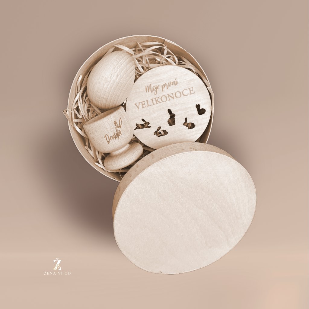 Set obsahuje: dřevěnou kulatou krabičku, dřevěný kalíšek na vajíčko, dřevěné vajíčko a kartičku.