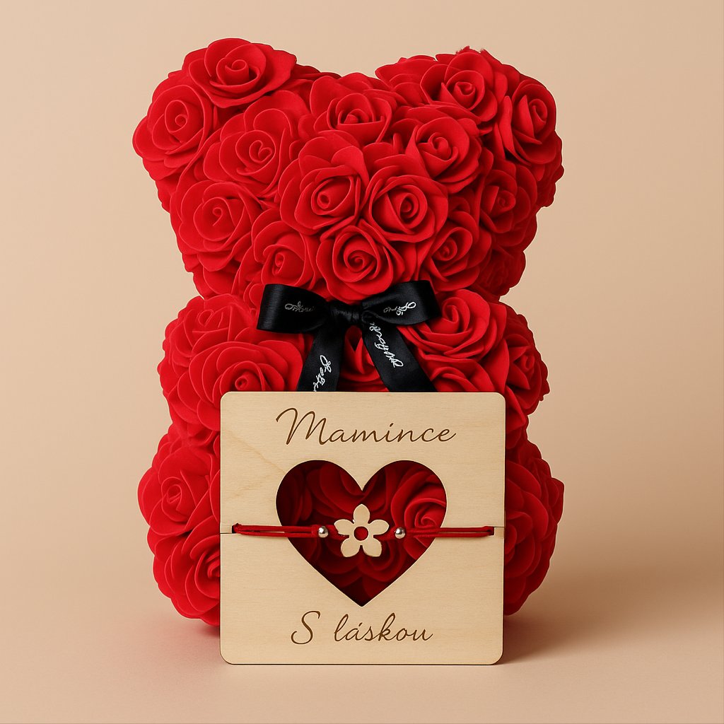 Dárkový set obsahuje medvídka z růží a náramek s motivem květinky, vygravírovaný z překližky, na saténové stužce. Obvod náramku se přizpůsobí obvodu Vaší ruky. Na destičku si můžete zvolit vlastní text, díky němuž se Váš dárek stane osobnější a určitě vykouzlí úsměv na každé tváři.
