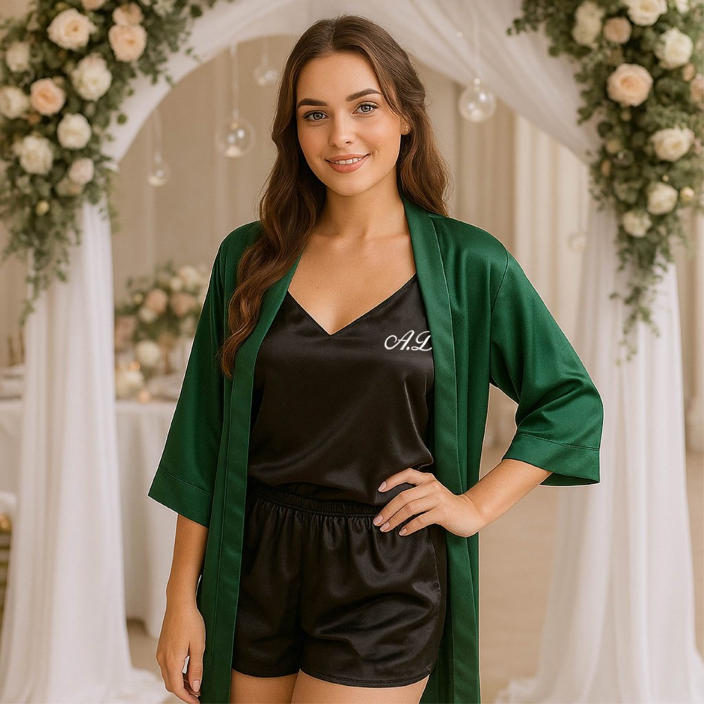 Set saténový župánek ZELENÝ a pyžámko pro DRUŽIČKU s iniciálami a datem