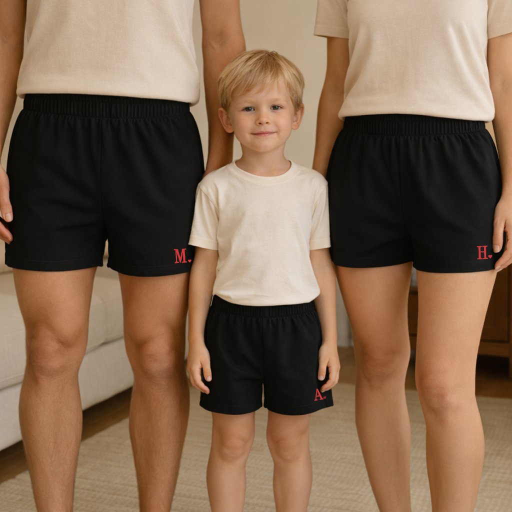 SET trenek pro mámu, tátu a dítě s iniciálami- černé s červenou tiskací se srdíčkem