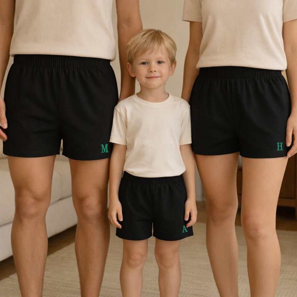 SET trenek pro mámu, tátu a dítě s iniciálami- černé s tyrkysovou tiskací bez srdíčka