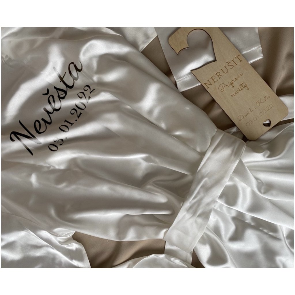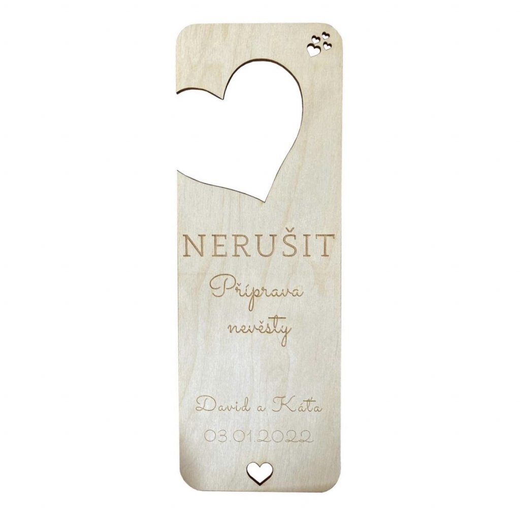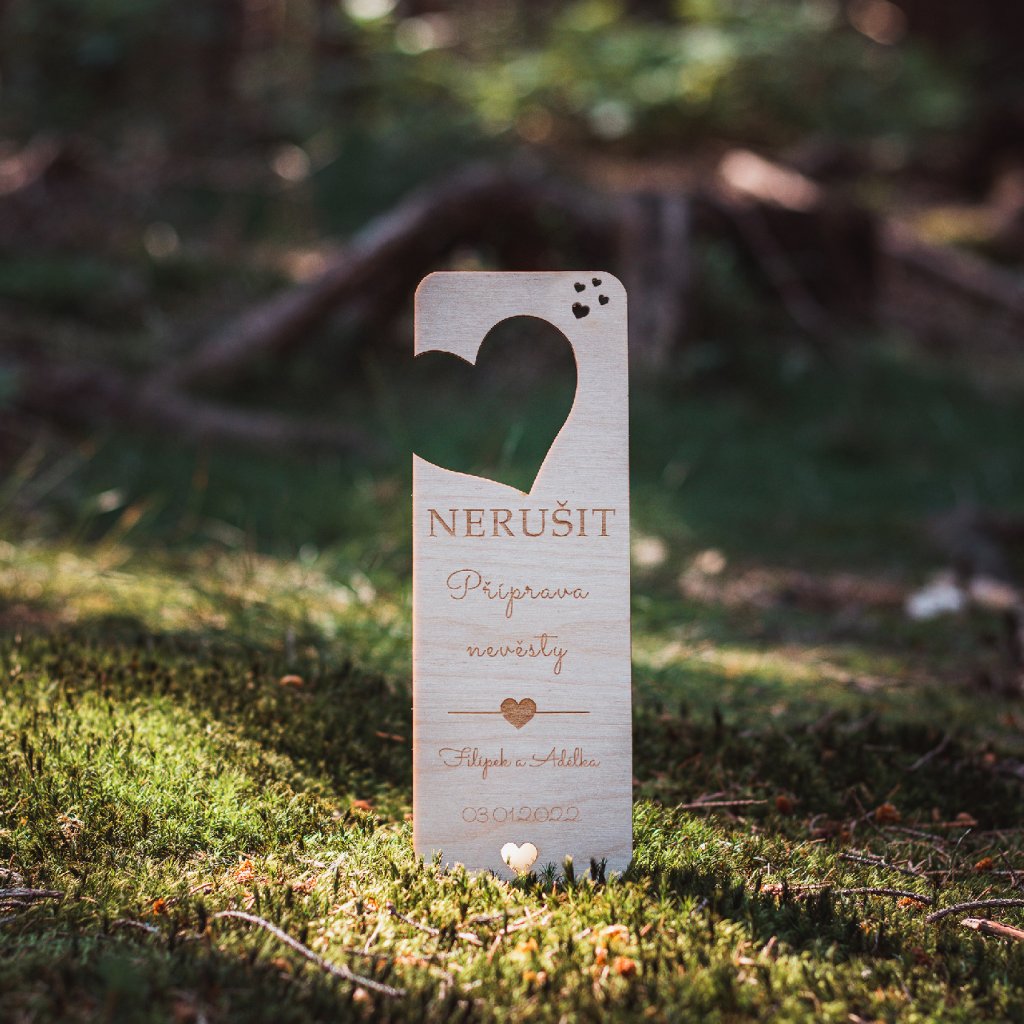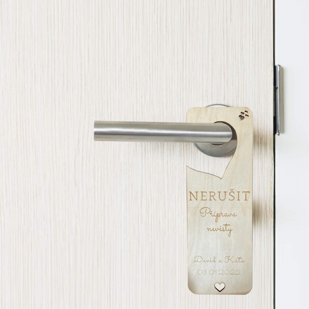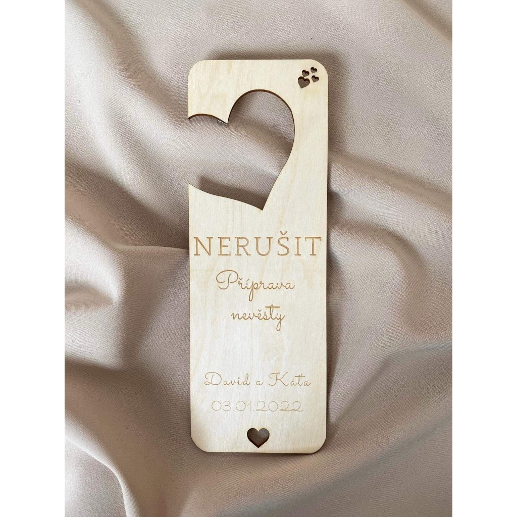Dřevěná cedulka na kliku pro přípravu nevěsty. Cedulka na dveře s gravírováním nerušit, příprava nevěsty, Vašimi jmény a datem Vaši svatby.
