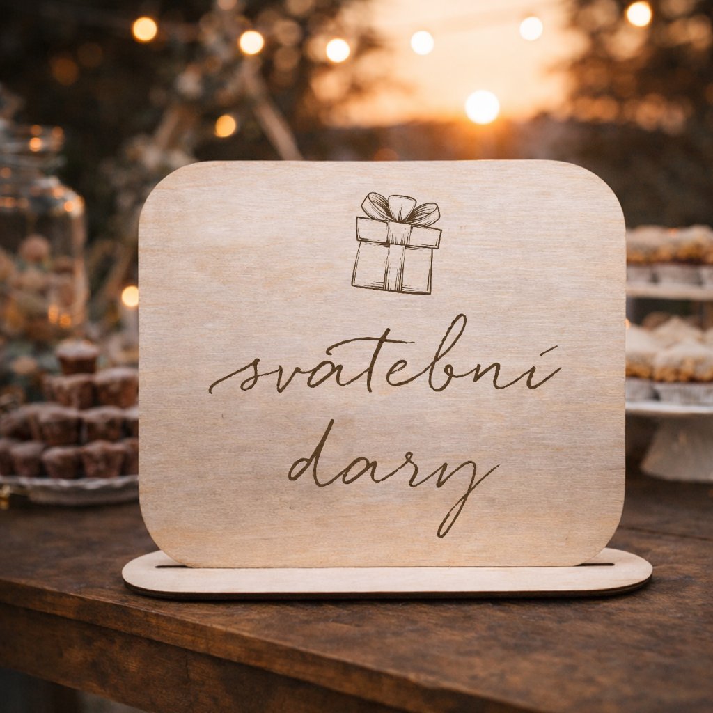 Dřevěná svatební cedulka s gravírovaným textem svatební dary, je skvělý způsob, jak si různě pojmenovat sekce Vaši svatby a svatebčany tak nasměrovat přímo k prostoru pro svatební dary.