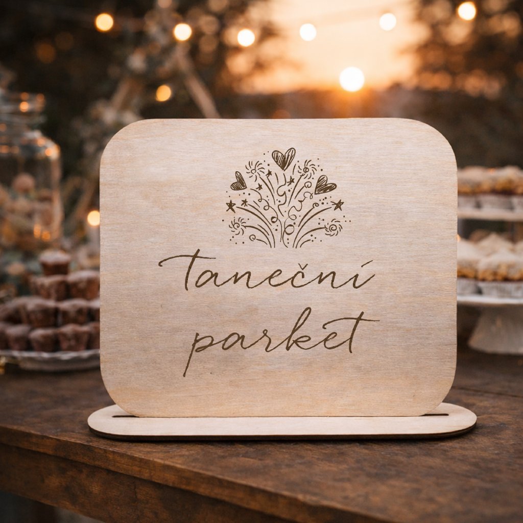 Dřevěná svatební cedulka s gravírovaným textem taneční parket, je skvělý způsob, jak si různě pojmenovat sekce Vaši svatby a svatebčany tak nasměrovat přímo k tanečnímu parketu.