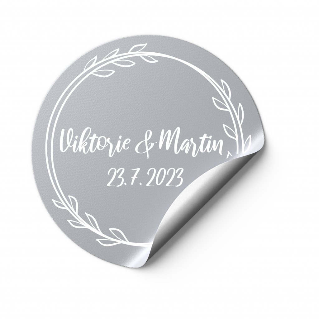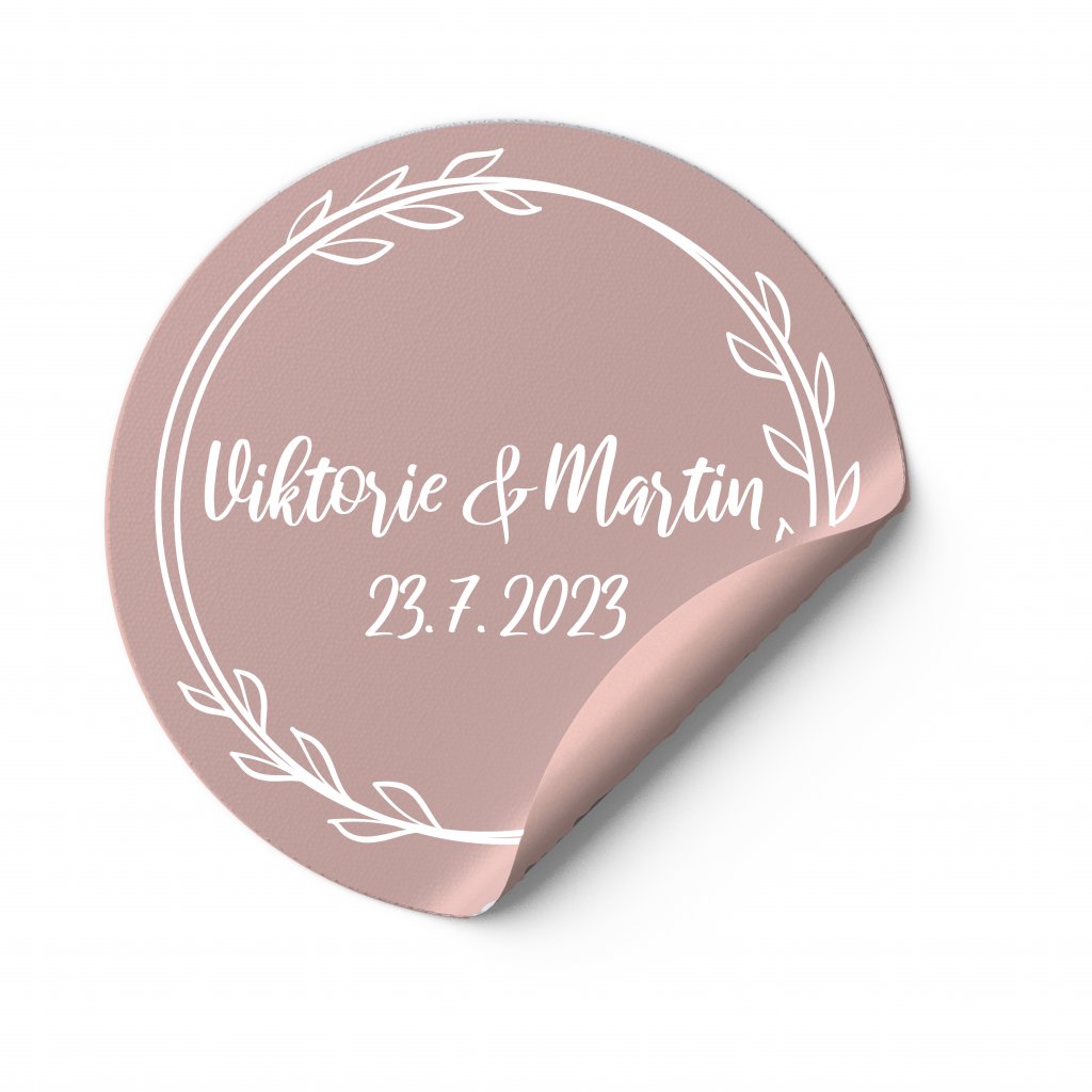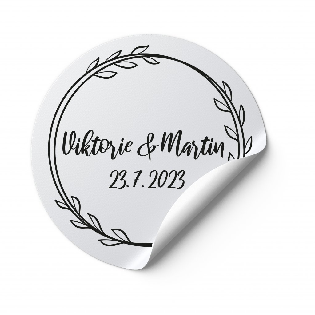 Kulatá svatební samolepka s vlastními jmény, kterou můžete ozdobit například svatební výslužky, obálky nebo dárky.