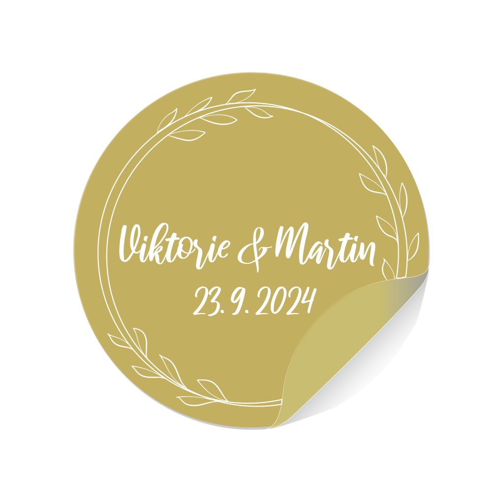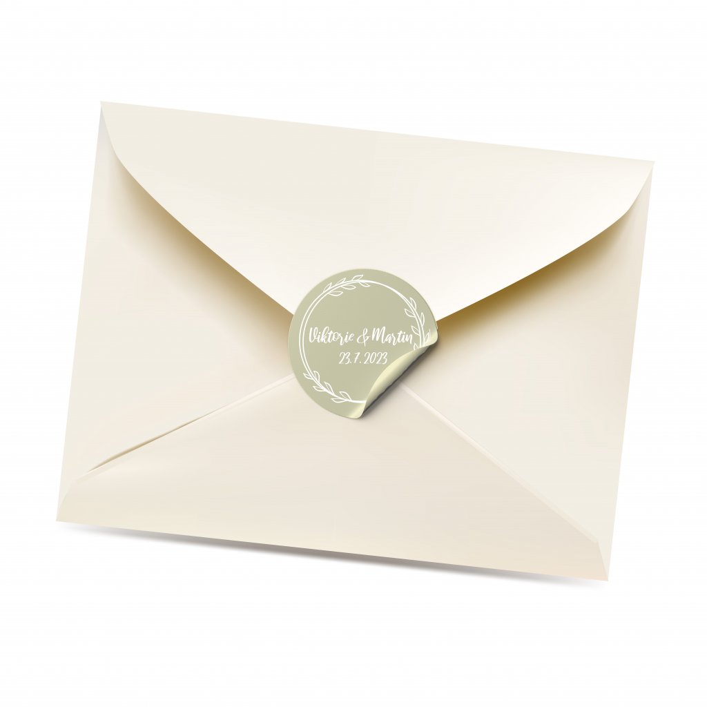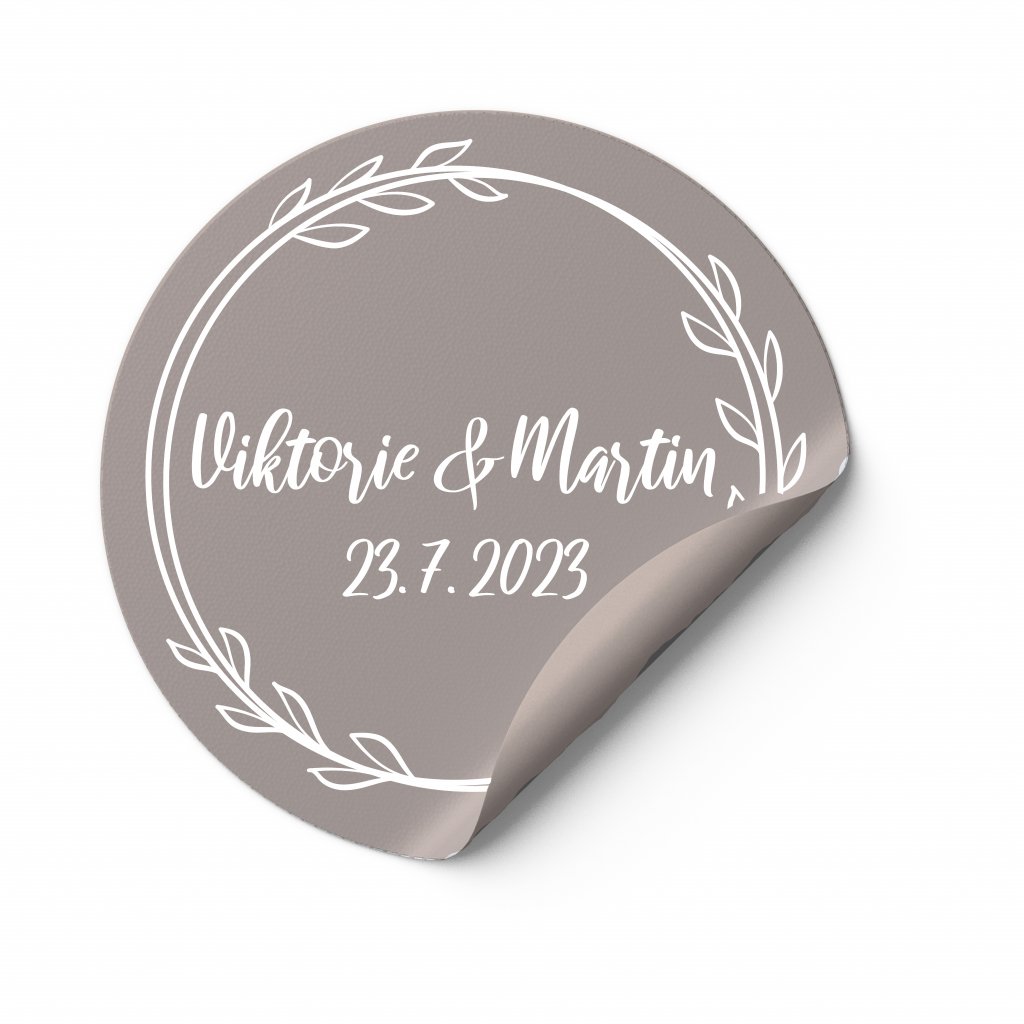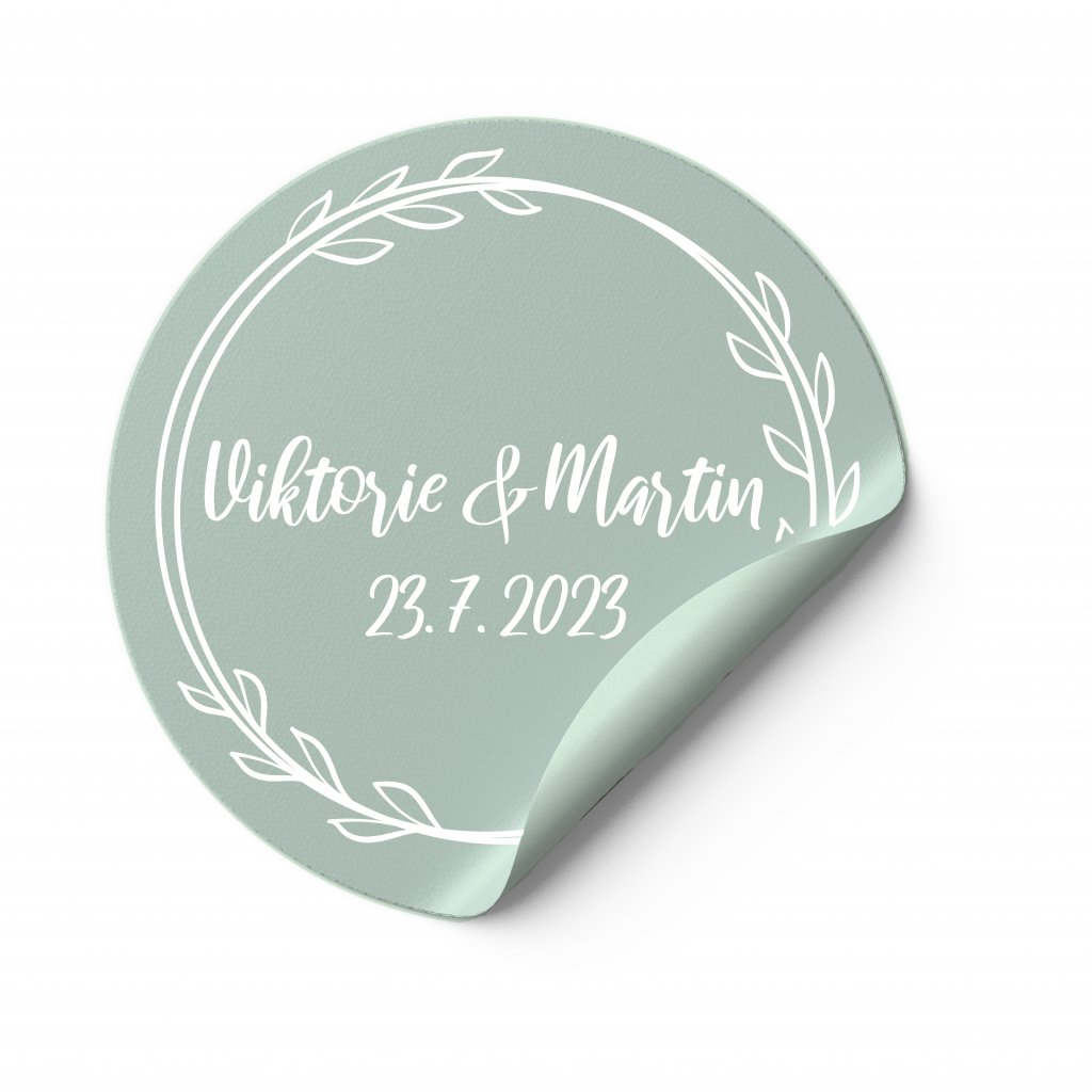 Kulatá svatební samolepka s vlastními jmény, kterou můžete ozdobit například svatební výslužky, obálky nebo dárky.