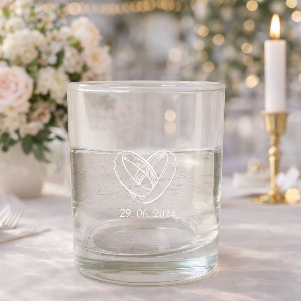 Svatební sklenice na vodu, whisky, nebo destiláty s gravírováním. Doplňte svatební tabuli o tyto krásné sklenice s datem svatby, které si můžete nechat na památku v domácí výbavě, nebo si je může odnést každý z hostů domů.