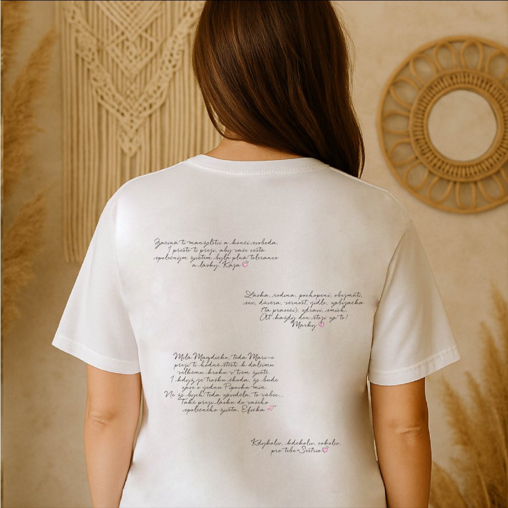 Osobní tričko pro nevěstu na rozlučku se svobodou. Tričko s osobními vzkazy může zahrnovat osobní přání, krátké citáty nebo milé vzpomínky, které nevěstě vykouzlí úsměv na tváři pokaždé, když si tričko oblékne. Objednejte ještě dnes a překvapte nevěstu jedinečným dárkem.