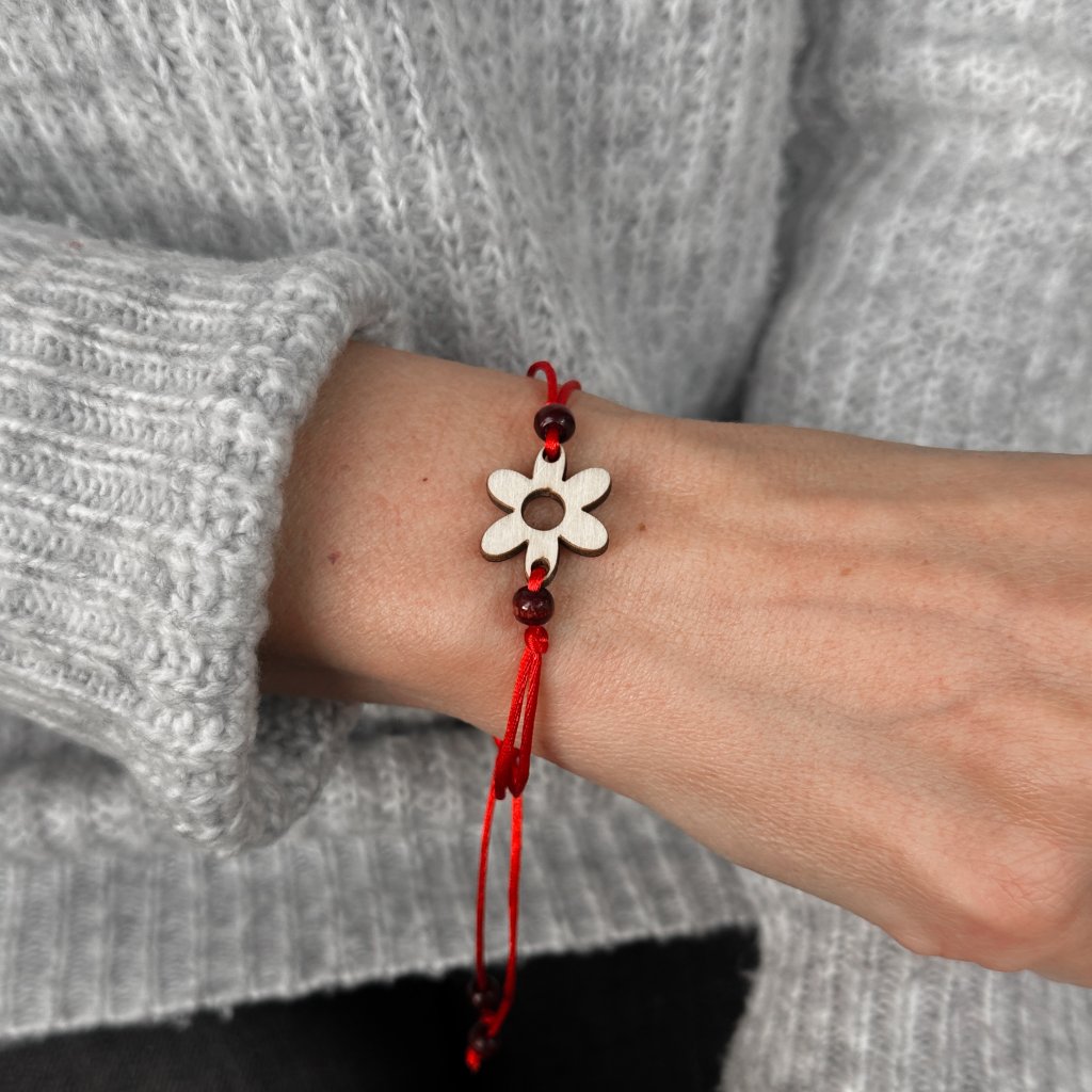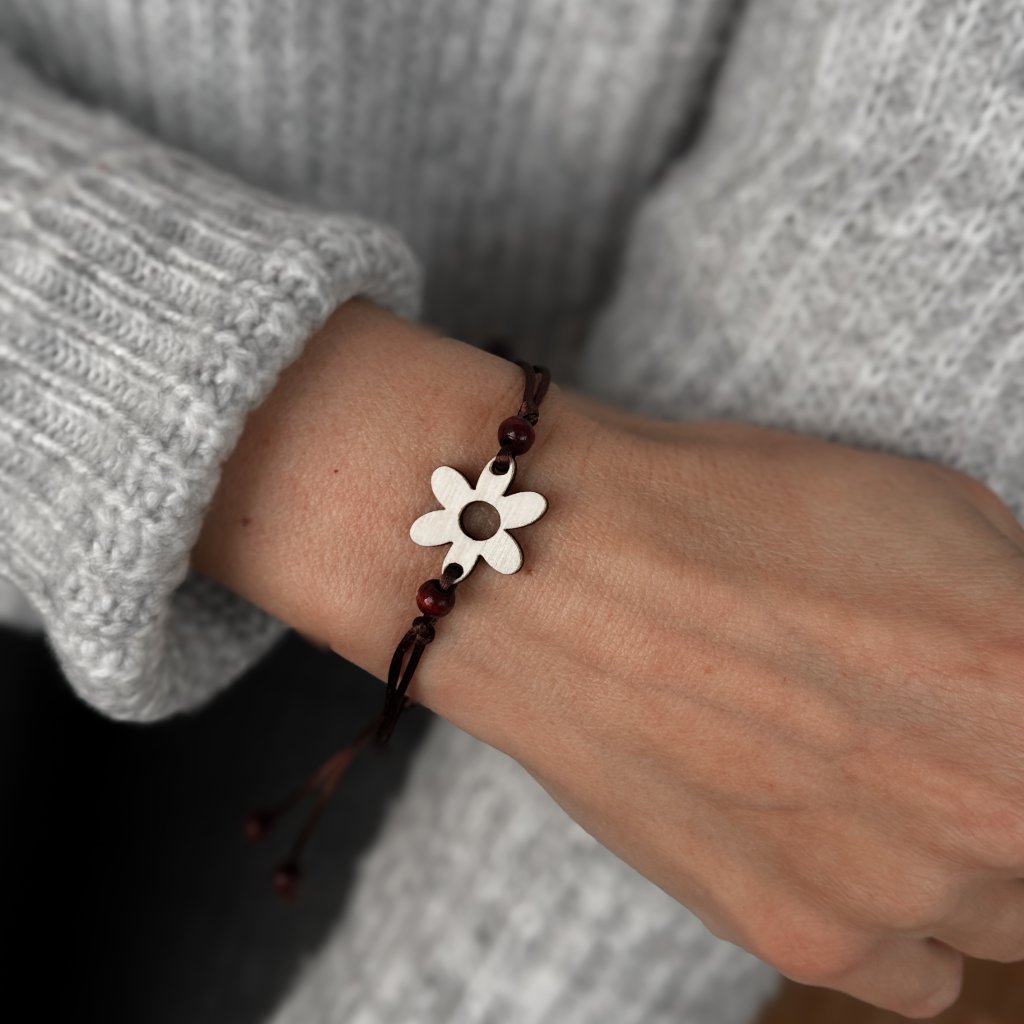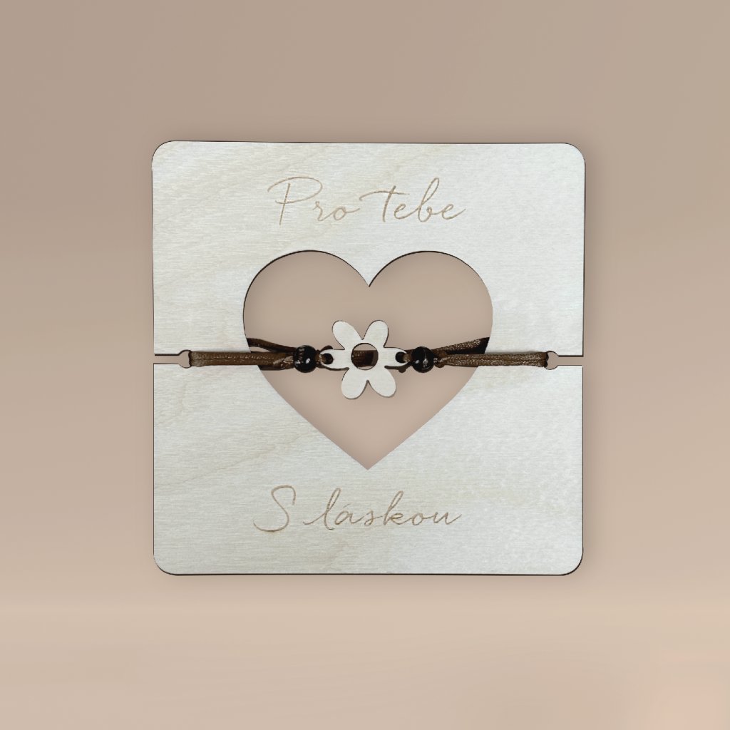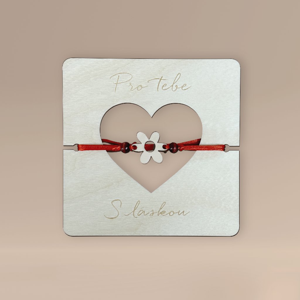 Náramek s motivem květinky, vygravírované z překližky, na saténové stužce v červené nebo hnědé barvě. Obvod náramku se přizpůsobí obvodu Vaší ruky. Náramky jsou originálním dárkem nejen k Valentýnu.
