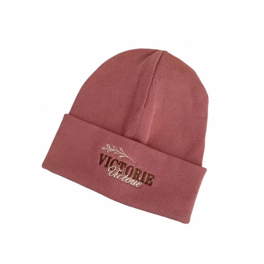Růžová zimní čepička s výšivkou Victorie, ve velikosti 3 - 5 let se už těší na svého nového majitele!