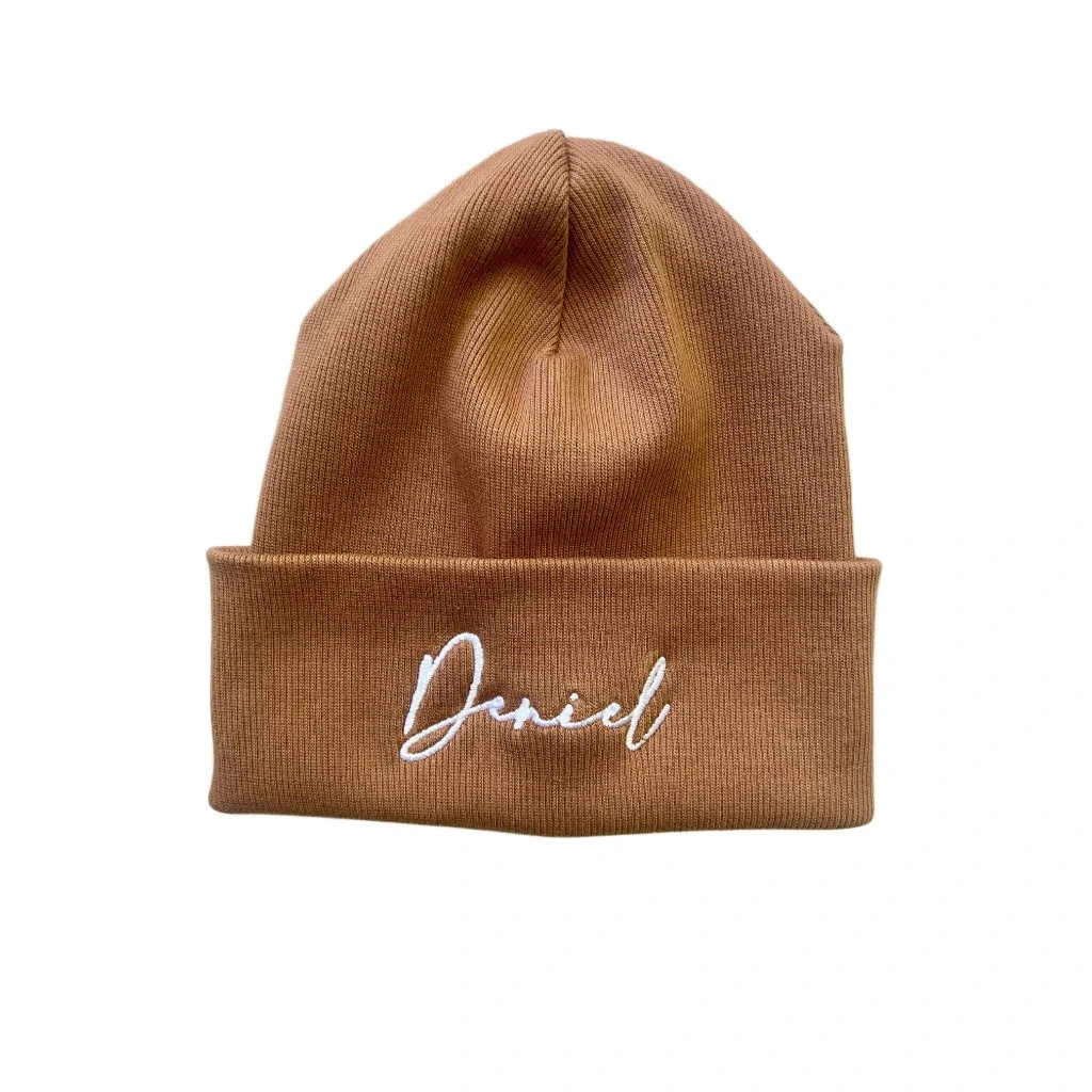 Hnědá zimní čepička s výšivkou Deniel, ve velikosti 5 měsíců - 3 roky se už těší na svého nového majitele!