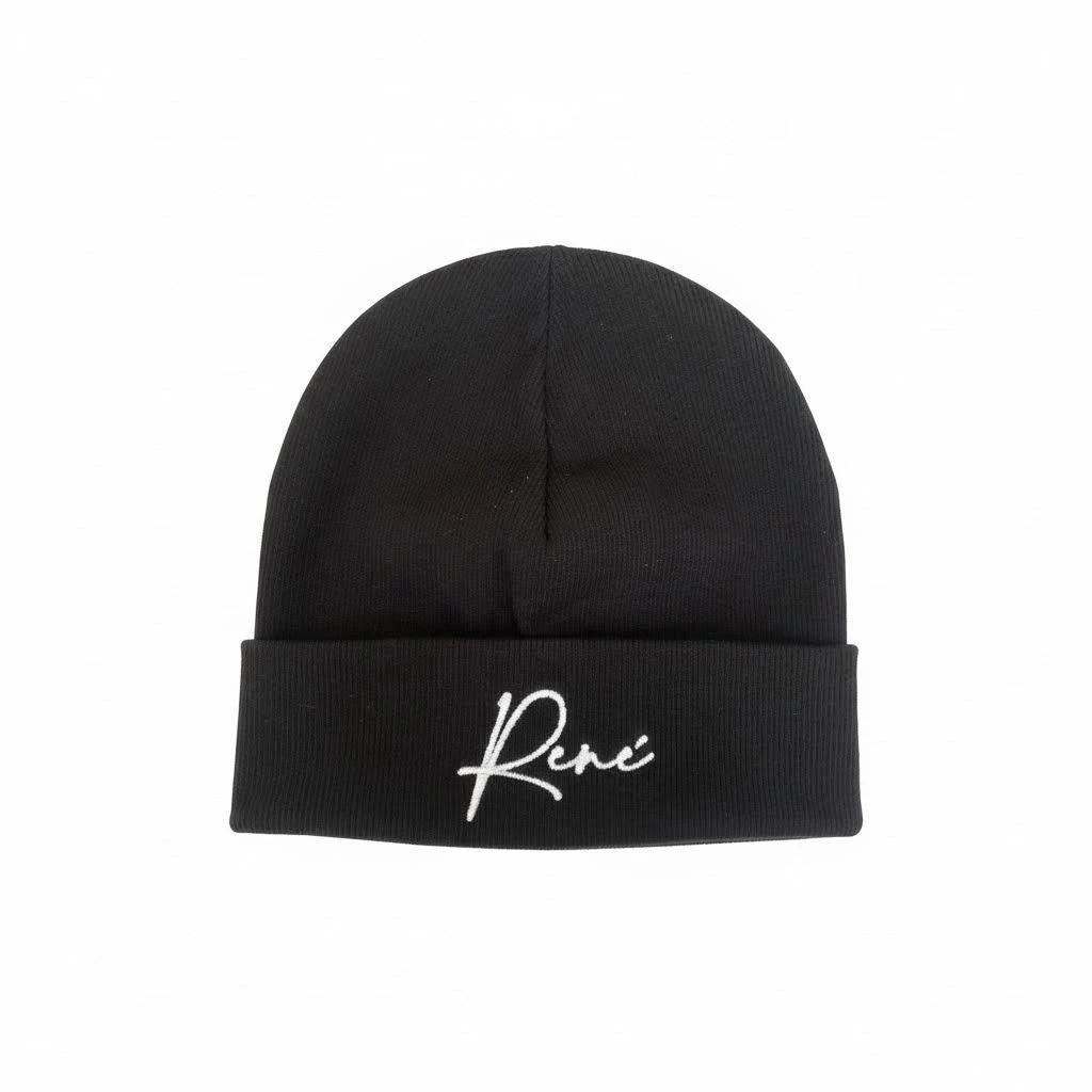 Černá zimní čepička s výšivkou René, ve velikosti 3-5 let se už těší na svého nového majitele!